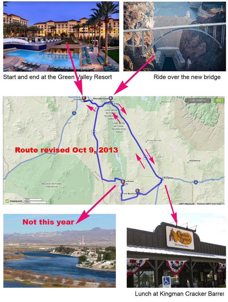 | Held in conjunction with the AMA's Hall of Fame Inductions at the Green Valley Resort, this is a big weekend for American Motorcyclists. Friday night is the gala banquet where the newest inductees into our Hall of Fame are honored. Sign up now and meet America's legends of motorcycling. To inquire about rooms at the Green Valley Resort, call (866) 782-9487. The specific schedule for the Vetter Challenge Thursday: Carol and I will be checking in Wednesday evening. 7:30-8:30 AM Breakfast with the Vetters at the best location at Green Valley Resort. To be determined and announced here. 8:45 AM Assemble in parking lot, Carol's grocery bag test. Remember, all 4 bags must all be loaded in your bike within 45 seconds. All fuel topped off. Photo session. Edwin Colon will videotape, same as last year. 9:30 AM depart. Follow our leader Paul Golde to the Kingman Cracker Barrel. Top off tank as necessary. Figure on a 1 1/2 hour layover. Note: As of Oct 9, 2013, the route has been shortened. At first, we thought it would be 250 miles. But when our Leader, Paul Golde, began fine tuning, he discovered that it was more like 289 miles. To shorten it, we will just return the way we came. The route is 200 miles total. This will be a more relaxed ride for all of us... especially for me as I am recovering from a major hip replacement. I know you will understand. Return to Green Valley Resort. I will see if the winner can be announced Friday night at the Banquet. | ||||||||||||||