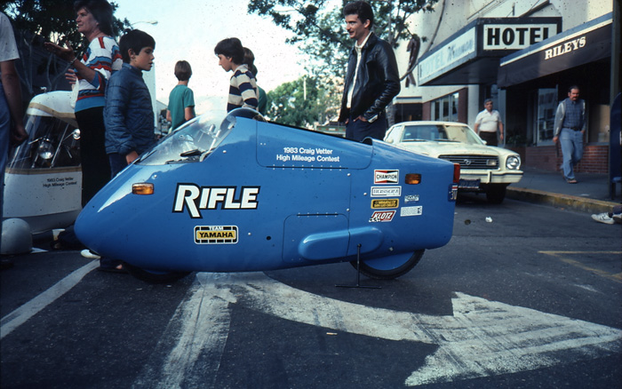 | Saturday is the motorcycle show and judging. The Vetter Challengers will leave at noon on Saturday. Of course, we welcome all riders who might want to ride with us to see what their mileage would actually be in "Vetter Condirtions". One of those conditions (to qualify to be a winner) is checking to see that each Challenger can carry four bags of groceries. Then we will head north to Salinas, on 101, a highway known for its maddening headwinds. Streamlining was made for headwinds. We don't even notice them. We have to stick our arm out to know if they are there. We are planning to take some back roads, too. The route will be longer than 125 miles but not longer than 170 miles. Riders will decide Saturday which roads to take. | ||||||||||||||||