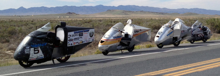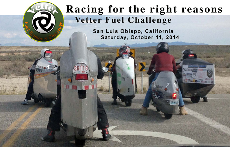 | Gasoline, Diesel and Electric powered Streamliners Which one can ride the way we really ride and consume the least amount of energy as measured in pennies per mile? The next Vetter Challenge will be held in conjunction with the 6th Annual Central Coast Classic Motorcycle Show, at San Luis Obispo, Saturday, October 11, 2014 | ||||||||||||||||