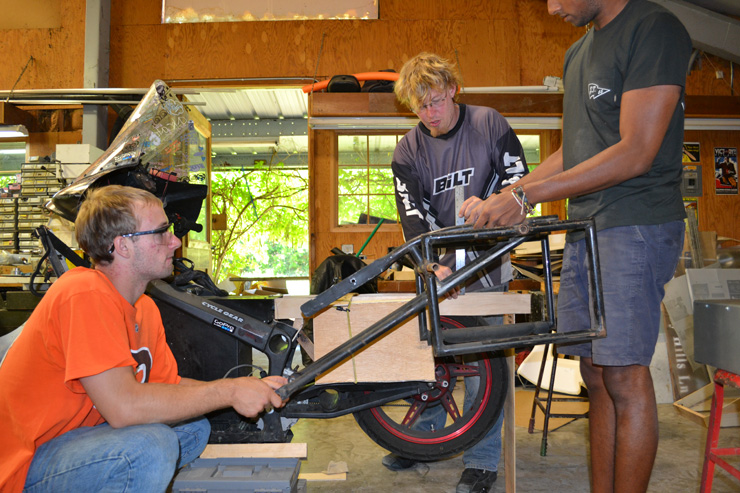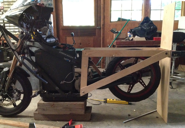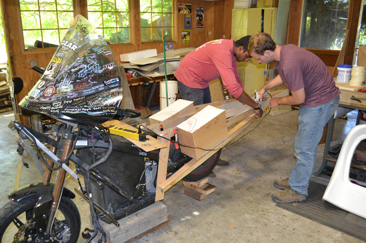| His two extra heavy battery packs had been mounted high at the rear, with the weight behind the rear axle. This made his bike impossible to pick up if it fell over. The new location was represented by the plywood box, above. Compare the plywood box location to where the battery packs were, within the steel frame being held by Stephen and Malith. | ||||||||||||||||||||||||||||||||