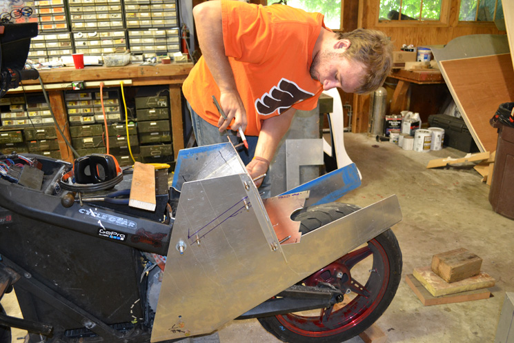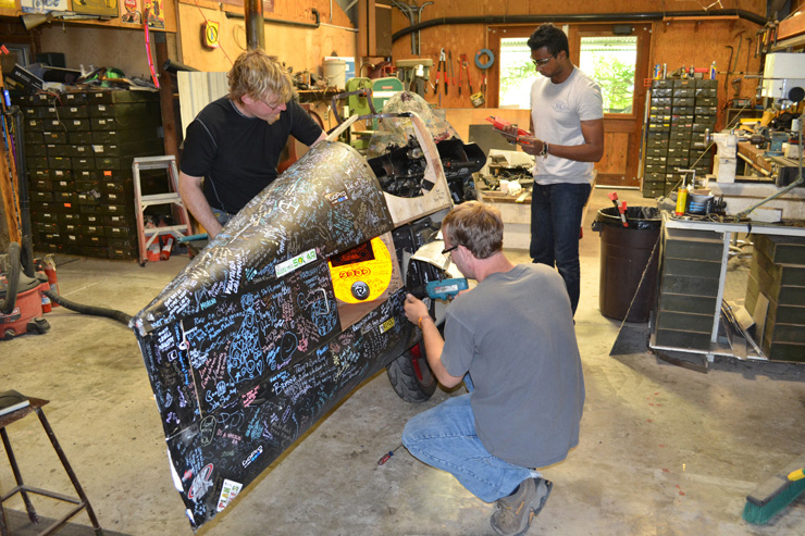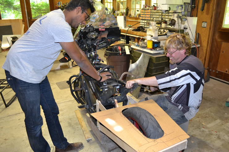 | We never had the chance to build a proper tail for him. When our friends at Virginia Tech sent two students to my shop in California, we finally found the time. Terry is on the left. Malith is behind to the right. Stephen kneeling in the foreground. The first thing we did was to remove the old tail. Actually it was falling off by itself. A great number of people had signed their names on the tail of Terry's Streamliner. Zero's dealer in LA, Harlan Flagg of Hollywood Electric, has Terry's original streamlined skin on display in his store. | ||||||||||||||||||||||||||||||||