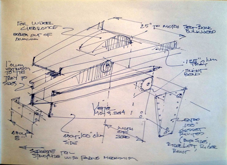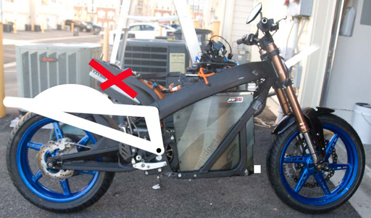 | Burton found himself a Zero setup for road racing and decided to turn it into a Vetter Challenger I sent Burton the sketch below. The red X indicated the frame portion that will be cut off to get the seat lower. Beginning with this sketch, we rebuilt Electric Terry's Zero. | |||||||||||||||||||||||||||||||||||||||