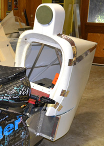 | We had a problem: After two weeks of work, Terry was still sitting almost as high as he was before. This was because we had gone to great efforts to keep his rear batteries within the 24" width of the front streamlining. But the nose was no longer 24" wide... | ||||||||||||||||||||||||||||||||||||||