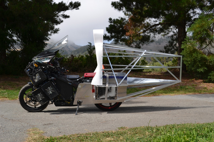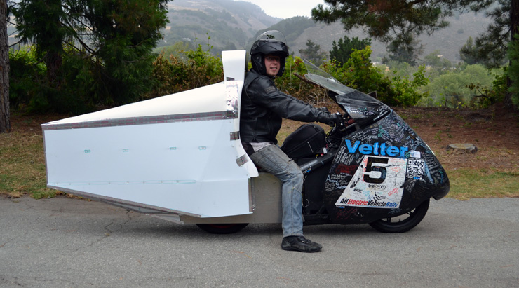 | July 2, 2014: Terry Hershner and his mighty Streamlined Zero ZF-18. Ready to set new electric records Postscript dated July 15, 2014: Terry never left California. Sitting on a bare metal seat pan instead of cushions, he rode his Mighty ZF-18 anyway, jamming his back. That was the end of his cross country riding for a while. We missed him but he was able to make his presentation at Vintage Days via SKYPE: | ||||||||||||||||||||||||||||||||||||||