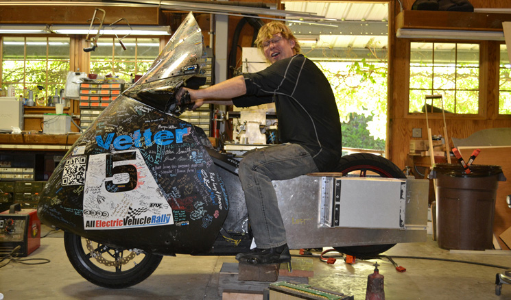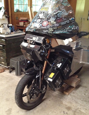 | When he charges, Terry consumes four automobiles worth of power! Four J1772 nozzles at once! Even tho, it still takes 45 minutes to fully charge. But then he can go 125-150 miles at 70-75 mph. No electric motorcycle in the world can do this. Terry Hershner is a true pioneer. Chargers are heavy. But if you want to charge fast, you have to have lots of them. Each charger weighs about 20 pounds which means that Terry is carrying 180 pounds of chargers! The best place to keep the weight is up front, which is why Terry had to spread the fairing out. | ||||||||||||||||||||||||||||||||||||||