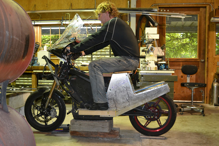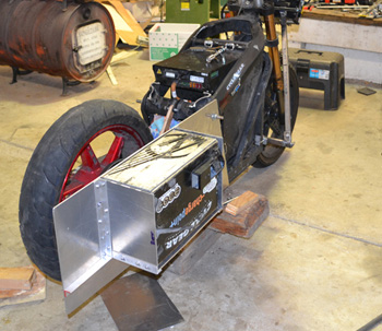 | Terry has 5 batteries* totaling 18kW hours of power. Three (integrated) batteries are already mounted inside the frame up front. We need to mount the other two at the rear. Because the nose is wider, the tail can be wider to match. Now, we can mount the batteries lower and wider. *He has one more 3kW hour battery he can add for record rides. | ||||||||||||||||||||||||||||||||||||||