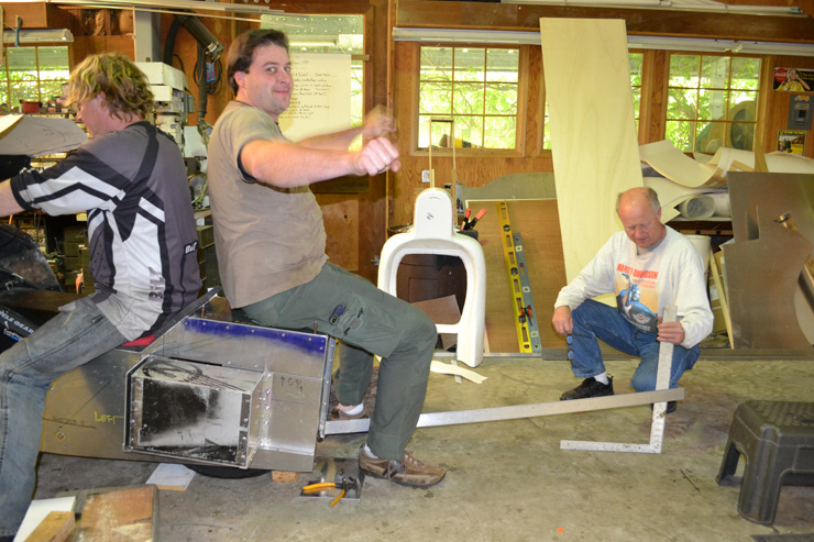 | Terry sitting, batteries in place, Zak bouncing and Alan measuring. We are trying to figure out the lowest the tail can be and not drag in road dips - like when leaving an angled driveway. | ||||||||||||||||||||||||||||||||||||||