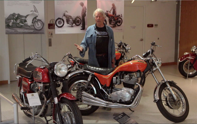 | There it was: The new Hall of Fame display featuring the original BSA Rocket 3 of 1968, the Vetter Rocket 3 of 1969 and a production Hurricane of 1973. These bikes have never been together before. Ever. While we ate pizza, the electric bikes charged and I rambled on about what things were like in the summer of 1969 when I designed and made this motorcycle. | |||||||||||||||||||||||||||||||||||