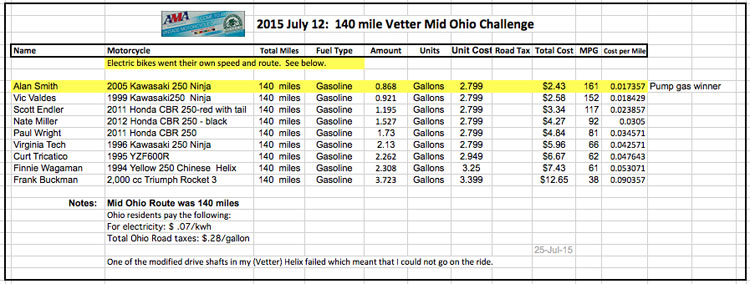 | The electric bikes rode much slower. Figuring the road tax is just too difficult here since they also ran different distances. Professor Goff probably still owed 16¢ or so for road tax. With the price of gasoline so low, Alan Smith and Vic Valdes still did better than the electric Challengers. | |||||||||||||||||||||||||||||||||||