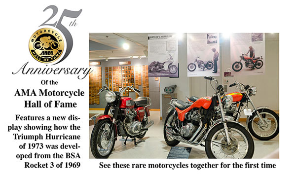 | AMA Ride Representatives Rob Baughman and Chris Harrison will lead us 77 miles to the AMA Hall of Fame Museum in Pickerington. Each leg of the ride will include 10 miles or so of freeway. When we arrive at the Museum, the electric bikes will probably want to plug in somewhere. The rest of us can also refill as ling as we hang onto receipts. We will have a 1 1/2 hour break at the Museum. Challengers will be allowed in for free. I will give a short talk at the new Triumph Hurricane exhibit. We will have plenty of time to eat lunch. There are great restaurants nearby. Upon returning to the gas station by Splash Harbor, we will fill our tanks. I will collect all the receipts and the Challenge will be over. It may take some time for the electric bikes to refill, which means we will not know the winners until the next day when they will be posted on my web page. Again... all are invited to ride with us to see what is possible. | ||||||||||||||||||||||||||||||||||||||