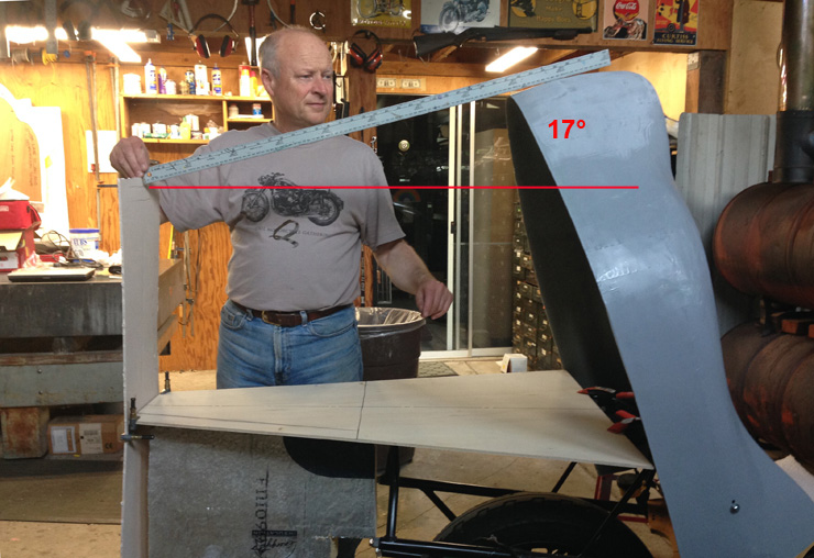 | Assuming that the 17° closing angle would be the best compromise, we made a temporary plywood tray and clipped the back off. We will make the part that continues to a point a separate piece. That way, the pointed section can be optional. | |||||||||||||||||||||||||||||