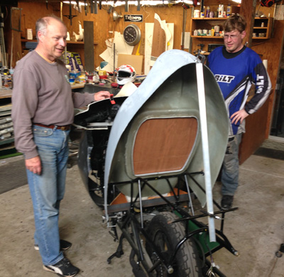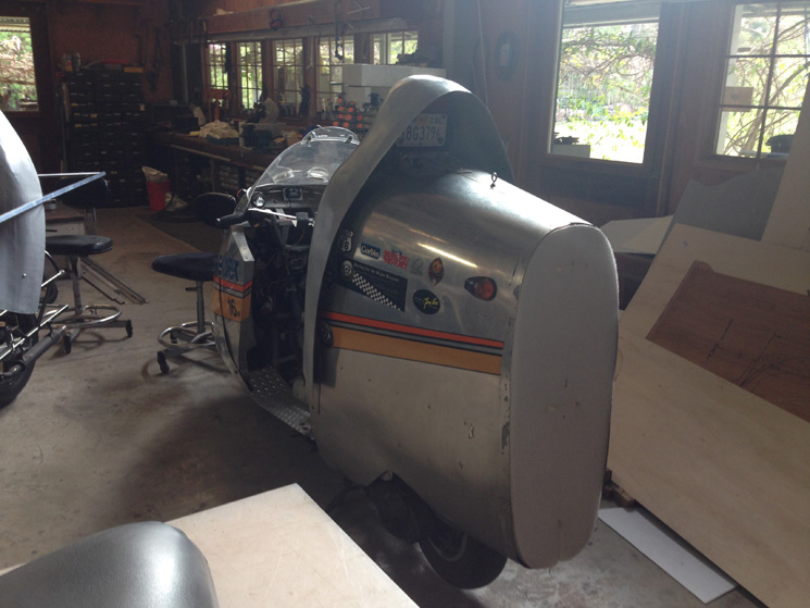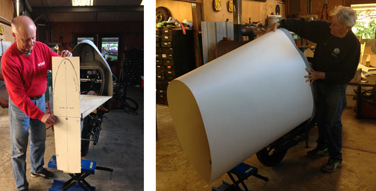 | We decided to cover the shape with aluminum tape and have a thin mold made over it. I had never done this before but it worked. Ignacio made the mold and a part for Alan to put on his "LowBoy" Ninja Streamliner. | |||||||||||||||||||||||||||||