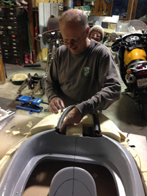 | We put it on Alan's LowBoy Ninja. Making a new tail from a seat bulkhead is a relatively easy job. The big question now is how to access what we store in the back. It sure would be nice to have an opening at the side. Alan and Terry were wondering. | |||||||||||||||||||||||||||||