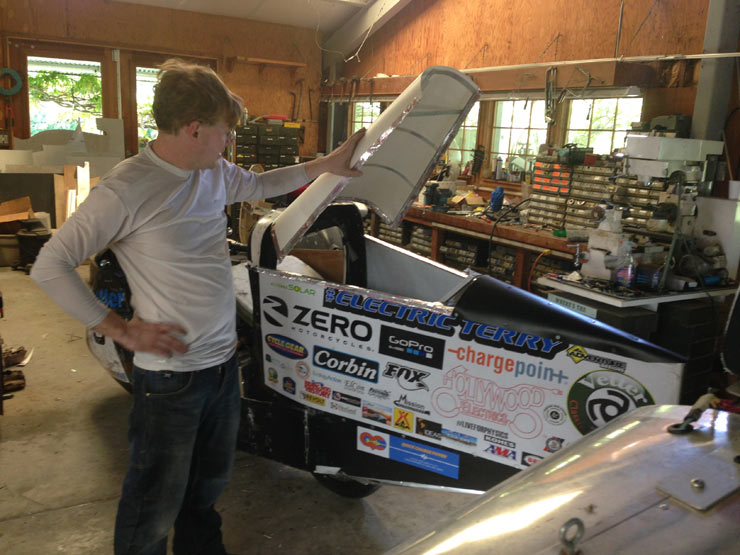 | Alan has been thinking about what would happen if he was ever "Rear-ended." It would not be good for the metal tray to be driven into his back. Therefore, we split the rear into two pieces, attached with plastic screws. If Alan is rear ended, the plastic screws will shear allowing the extended portion to telescope forward, collapsing into itself. Think about that when you build your streamliner. Electric Terry came up with an access hatch: | |||||||||||||||||||||||||||||