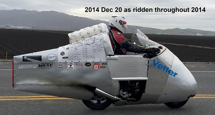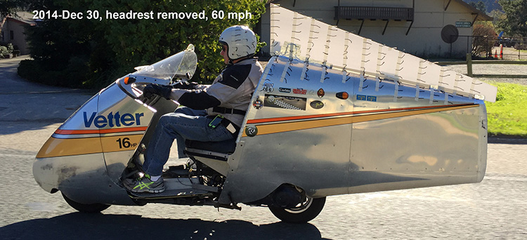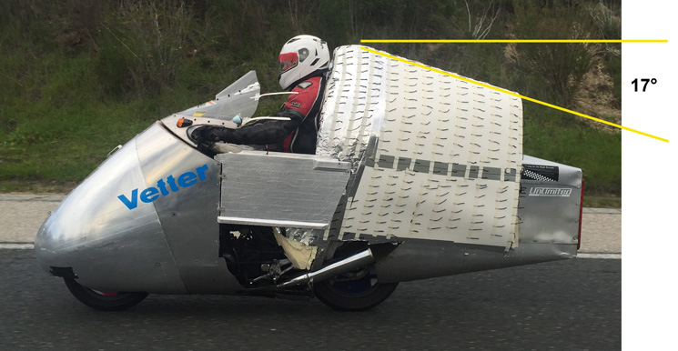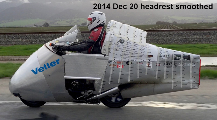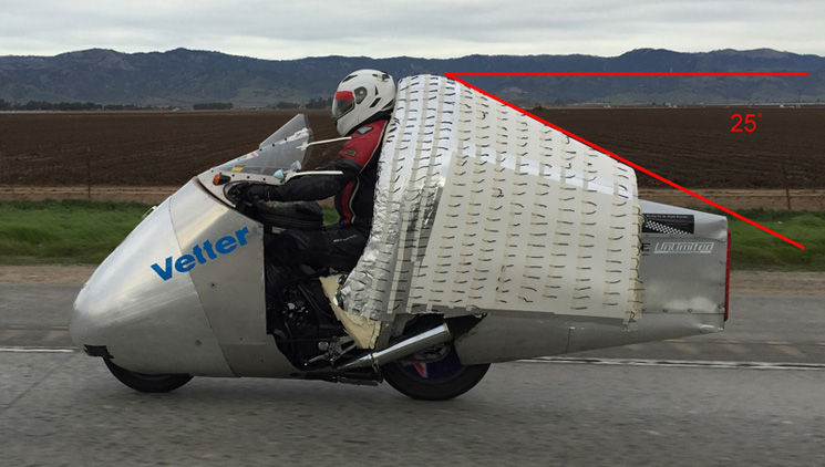 | Real streamlining has doubled the distance a unit of energy can take us at 70mph. Confirming this in the Vetter Challenges has been a BIG thing. Now it is time to see if the BIG parts can be refined. There has always been some question about the exact shape of the tail. I always was prepared to "write off" the "dirty" air behind the rider's helmet. But do I have to? what really is happening to tha air behind the rider? | ||||||||||||||||||||||||||||||||||