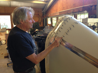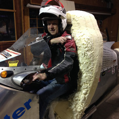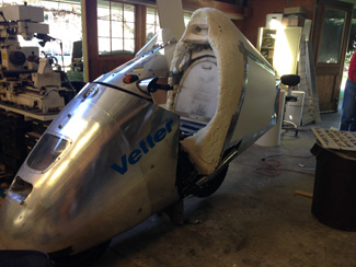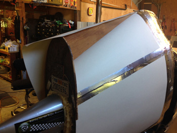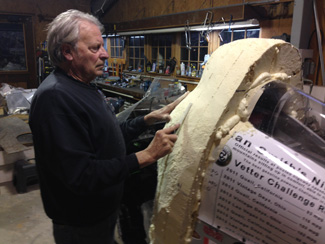 | At this point, we have no idea what this thing will look like. Alan sits and I add foam between him and the Streamlining. Then I file the foam down, blending it to the streamlined rear. Whatever it is, it is. Actually, this is my favorite way to design. There is nothing arbitrary. It must be this way. | ||||||||||||||||||||||||||||||||||