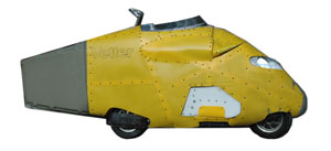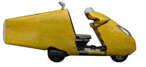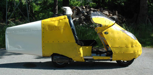 | 2009: Fully streamlined, it would now easily go 75 mph and get 64 mpg in "Vetter Conditions". I love the storage capacity. But with the sides fulley covered over, sidewinds moved it more than I wanted. I made a gap in the center for air to blow thru. | |||||||||||||||||