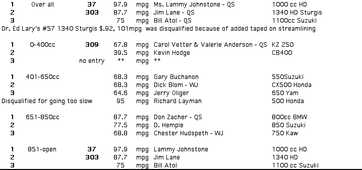 ![]() | Check out the overall winners. They are all Harleys! As I recall, they were geared up so the engine turned slowly and they got into high gear as quickly as they could. They were consistant... all getting from 88-100 mpg. Many of you have noticed these "promising" mileage numbers. | ![]() | ||||||||||||||||||