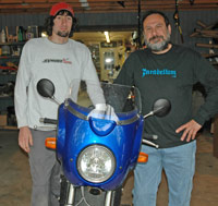 The modifications made in Matt's own words: Lengthened the wheel base, added about 4 degrees rake to the frame. The motor was modified by Fujio Yoshimura. He added the 6th gear from the Quadrunner LT125, the cam from the Quadrunner, smaller intake valve, and some internal work to reduce friction. We used the stock carburetor, air cleaner and filter from the GN-125. |