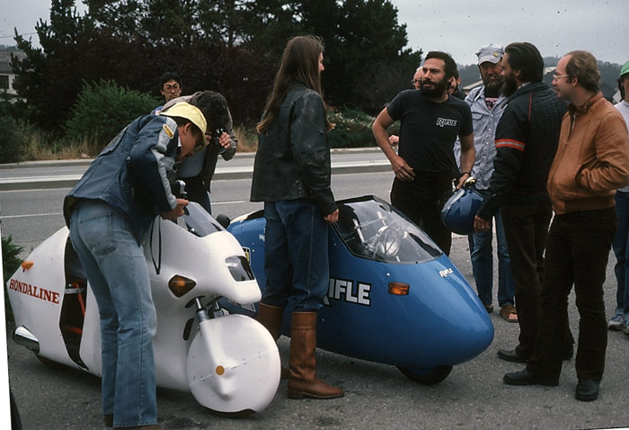 | This image dramatically shows just how small the bikes were. Lisa Luke piloted the Hondaline 185cc streamliner to 255 mpg on Saturday. But it was Charly Perethian (black Rifle shirt) who got 372 mpg on Saturday on the road, backing it up Sunday on the track with 365.93 mpg! | ||||||||||||||||||