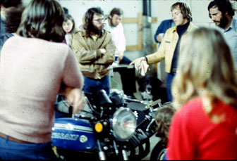 | Dan (in yellow jacket) is explaining his bike. Charly Perethian (with the black beard) is to Dan's left. Could anybody have imagined the mark these two would make in motorcycle history ten years later? | |||||||