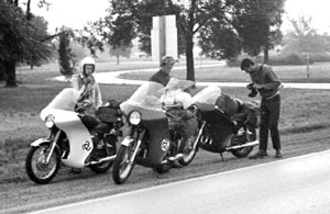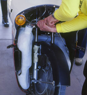 | Matt had built a special, extra 10 gallon tank up front. Gas weighs about 6 pounds per gallon, which means he had about 70 pounds of extra weight up front. See more in the August, 1984 Motorcyclist magazine. In my interview with Matt, he explained that with that extra weight up front, the effects of sidewinds were dramatically reduced. The effects of winds increased as the fuel burned off. This is a clue as to what can be done. "For good handling, the center of pressure needs to be at the rear and the weight up front" Matt Guzzetta's comments to me are recorded on my DVD: When I return to California, I will hang some lead off the front and see what happens. In the meantime, I was not prepared to be mobbed in Ohio. | ||||||||||||||||||||||||||||||||||||||||||||||||||||||||