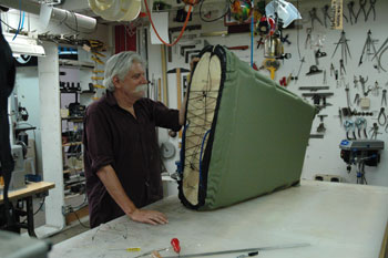 | Thin, lightweight plastics and a lot of foam are the future if we are to "Do more with less". Here my brother, Bruce helps to make a new foam tail that weighs 3 pounds. Remember... for good handling, the weight needs to be at the front... not the rear. This tail is intended for highway use, and is held on with bungee cords. For in-town riding, we don't need it and leave it off. Without the tail, the bike is as long as a regular Honda Helix. | ||||||||||||||||||||||||||||||||||||||||||||||||||||||||