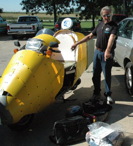 | The ride would be a good time to ponder it all. I filled my storage space with my presentation equipment and headed east on I-70 at 70 miles per hour. The winds were awful, blowing generally from the north so hard that the flags were straight out. Speeding semi-trucks were troublesome. I had learned months ago that I could feel the winds more as I added streamlining. On this trip, my first with the nose covered over, there were some really worrysome moments when I got sandwiched between two speeding semis in the worst cross winds. We don't like this situation on any motorcycle. But I must admit, the effects of sidewinds and passing semis is worse on my streamliner. I ran pretty much wide open all the way. My mileage was around 56 mpg in these conditions. (with 10% ethanol) | ||||||||||||||||||||||||||||||||||||||||||||||||||||||||