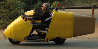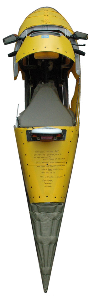 | On the top is written: "The goal is to get 100 mpg at 70 mph, into a 20 mph headwind with 4 bags of groceries. It all begins with streamlining and then the right horsepower. This is real streamlining. This is 18 hp. This is a work-in-process. Craig Vetter Designer, July, 2008" | ||||||||||||||||||||