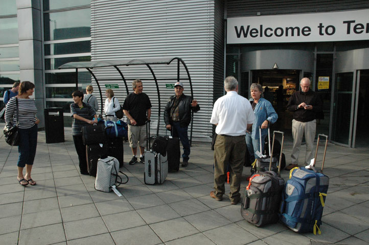 | The Yanks begin arriving in England. From left: Sherry Romero, Gene's wife. Geneo- their son. Gene Romero, Don Castro, Beezumph's Dave Smith in white shirt, Carol Vetter and Don Emde. Rob North, frame builder was on his way. Carol and I were invited by the British Triples club, Beezumph to attend their 17th event at Cadwell. In 1971, a Match Race was conceived to pit America's best road racers (my heroes) against Britain's best road racers, (also my heroes). Here they are, 37 years later, arriving again. See the story on Beezumph 17.