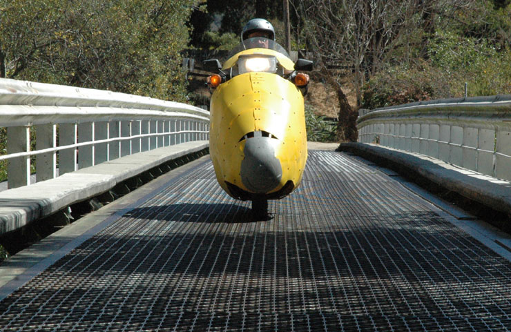 | The Real Test: A 300 mile trip down the Pacific Coast We headed for Big Sur and Arroyo Grande, Carol riding her GS650 with #3 prototype aluminum (un named) fairing. I rode the Helix Streamliner. Immediately, I noticed that the Helix felt more "substantial" than before. To get to the main road, we must pass over an open grid metal bridge, the kind that always makes motorcycles squirm. This time my Streamliner did not even notice the grid. This was a dramatic change. I always thought it was the tire pattern that caused this. Now I know it is weight on the Helix. At the beginning in Carmel, there were no winds, but by noon, the winds built up to become very powerful - blowing from the ocean side (right) and a little from the rear. We rode 55-65 mph along the Pacific Ocean passing the devastating fire damage. 70 mph, closer to SanLuis Obispo. The effects of the wind on the Streamliner had ben dramatically reduced. This was a new machine! We rode the exact same way and recorded our mileage. 131 miles later in Arroyo Grande, where it was 100 degrees, we filled up. | |||||||||||||||||||||||||||||||||