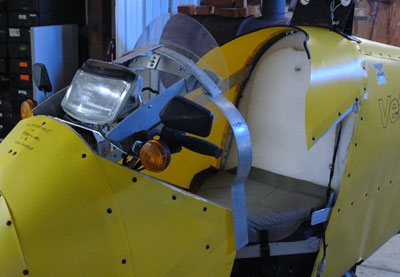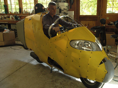 | Look at this mess. I never finished it last summer when I left for the midwest. The tail-light sticks up way too high. The mirrors and turn signals stick out. Air blows in around my arms. The stock Helix headlight is a flat plate in the wind. Now that I have dealt with side winds, it is time to finish the streamlining. | ||||||||||||||||||||||||||||||||||||||||||