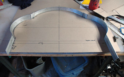 | Today: My first job is to make an aluminum bulkhead to locate the windshield where it has proven to work. This bulkhead will be frame mounted. The sides of the bulkhead are bowed out to clear my arms at full lock. What I want to do is make a fixed bulkhead that I can continue to the rear in a smooth, streamlined shape. | ||||||||||||||||||||||||||||||||||||||||||