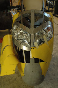 | Having chosen plastic "Christmas Tree" fasteners to hold the yellow plastic made it easy to peel the skin away. Altho the fasteners get a little torn up, they can be re used. The lights fit in amazingly well, but not perfectly. The main bulkhead is about 2" too far forward to allow them to be aimed exactly straight forward. This will be easy to correct when I make a mold for the front. In the meantime... these lights look good to me. I will just use one headlight. The Helix probably does not have enough electrical output for both lights. | ||||||||||||||||||||||||||||||||||||||||||
