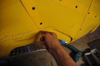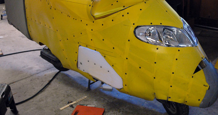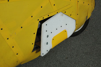 | I enlarged the opening 2" for my leg to stick out and added aluminum strips behind the yellow plastic for structure and began work on a flexible door. My plan all along has been to not use any outriggers to hold me up. My plan has been to use flexible, lightweight plastic foam for a smooth door. Such a door must be: Simple Lightweight Rattle free Not more trouble than it is worth Fool proof Absolutely non-impeding (It must not slow down our reactions even by a fraction of a second or we might fall over) Whatever works for the right side will work for the left side. | |||||||||||||||||||||||||||||||||||||||