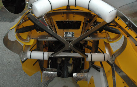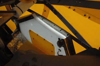 | I wrapped the foam door with the yellow polyethylene skin material, which is very slippery. Think of polyethylene as "poor man's Teflon." I placed it only where my foot made contact, since too much tended to make the foam door stiff, preventing it from bending. Then I wrapped the floorboard with a matching piece of yellow polyethylene. The opening is now very slippery. | |||||||||||||||||||||||||||||||||||||||