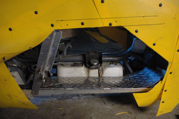 | Floorboards: All this time, I have been riding without floorboards. My feet have been resting on the engine radiator supply pipes. Once, while riding on wet grass, I had to get my right foot out fast to keep from slipping over. I almost didn't make it because my foot snagged for a fraction of a second on the junk inside. It was time for floorboards. "Christmas Tree" push-in fasteners made it easy to take it apart | ![]() | ||||||||||||||||||||||||||||||||||||||