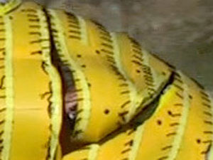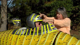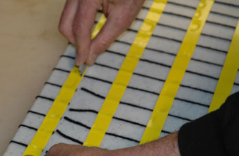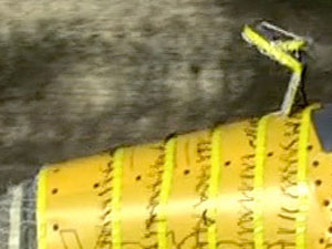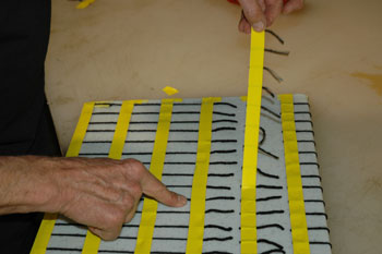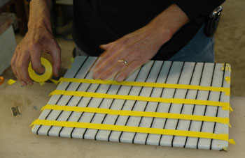 | Carol donated one of her plastic cutting boards. I wrapped yarn around it about 1" apart | I found yellow electrician's tape to run the other way, about 2" apart. | |||||||||||||||||||||||||||||||||||||||||||||||||||||||||||