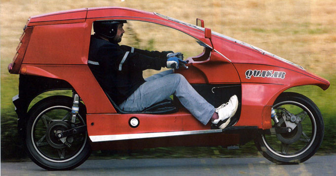 | I certainly get this on my Quasar. At several points in London traffic jams form on bridges, where there is a set of lights at the far end of the bridge. Once stopped in traffic, with not much room on either side, the wind blowing down the river really rocks any high-sided vehicle. It takes both feet to hold the Quasar up. Of course once standing still the wind force is proportional to the entire side area (including any tail) and all steering effects are lost. Yep... I know what you are talking about I hope you don't mind this long note, I am suffering from a cold and am probably slightly feverish. I hope to catch up with you when you visit the UK in August. Best regards Andy PS I look forward to seeing which slightly more powerful vehicle you will use as a basis for the next stage. The Helix of course has a wonderfully low seat height, and a low seat is an important factor in reducing frontal area. Several people here have lowered the seats on the Yamaha TMax but I don't think that machine is imported to the US. I look forward to my visit to the UK this summer, too. Meet the "Pioneers in Feet-Forward Design" | ||||||||||||||||||||||||||||||||||||||||||||||||||||||||||||
