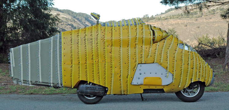 | The Helix has been a good test mule to develop streamlining. It has about the right horsepower (13-17, depending upon who is reporting. Nobody seems to know for sure). It is quiet and comfortable, cheap and reliable. I have been able to buy a second one for side-by-side comparisons. Both are stock and unmodified. Only the streamlining is changed. The streamlined Helix goes faster and burns less fuel. But streamlining has allowed the Helix to go too fast. It easily travels at 75 mph, into fierce headwinds. This is like going 90 mph and way is too fast for this scooter. Maybe it is the tiny wheels... maybe it is the lack of gyroscopic effects we would be getting from larger wheels. Maybe it is the minimal suspension. All I know is that I don't want to be on the freeways with big trucks at 75mph on this thing. Honda engineers simply did not make a Helix for such speeds and conditions. Therefore, I am almost done with the Helix as a platform. I will keep riding it continue my experiments. But, I have gone about as far as I can on the Helix. Finishing the Streamlining. My plan is to go back to the original foam pattern and make all my changes to it. I am pretty happy with the Dodge Minivan headlights (from 2001 02 03 04 05 06) They fit and can be purchased inexpensively on EBAY. These lights fit the shape, have running lights and turn signals. They solve a lot of problems. After finishing the existing left side, I will do the tooling for the opposite side. My plan is make molds of the front only (where the compound curves are) and then make tooling for vacuum forming. Vacuum formed parts will be very light weight and be easy to ship. I plan to design this to be a Streamlin Kit - like model airplane kits of old. The windshield and mid sections can be made from sheet plastic. All this will be designed to be easily shipped. Rest assured that the final shape should easily fit onto any scooter or cycle. Remember, the streamlined body we have developed here is for a person. No matter which bike it goes on, it will be just big enough for the person. I like kits. | ||||||||||||||||||||||||||||||||||||||||||||||||||||||||||||