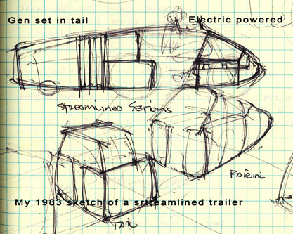 I was thinking that if the power-supply trailer itself added a little forward push, then the bike itself wouldn't have to be overbuilt with a heavier motor than it needed for the short in town errands. Only for long trips would it need the extra push, when it was pulling extra battery packs. When the bike was all by itself running in-town errands, it wouldn't need to be lugging around a heavier motor. Does that sound reasonable? They would be incomplete shapes by themselves. but that is OK. The front would be for around town, generally slow. the rear gen set would complete the streamlining for the road where streamlining is more important. Does it make a little better sense saying it this way? Vetter says: I think the solution is in the above sketch. Is it more effective to have one complete streamliner "drafting" behind another complete streamliner, or is it better to blend both together into one single long streamliner? (may flex in the middle at the trailer hitch) Here is A GREAT DESIGN PROBLEM: The connection between the tow vehicle and the trailer: How do you articulate it and keep it smooth? You just might be the person to come up with the Great Solution. | ||||||||||||||||||||||||||||||||||||||||||||||||||||||||||||||||||||||||||||||