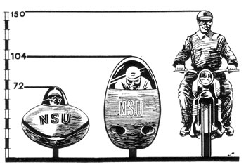 ![]() | Craig replies: Thank you, Steve. I love this stuff. However, we must consider yet another factor: Seeing the road ahead. The above pics are of a 50cc NSU streamliner, playfully referred to as the "Flying Hammock". Its designer, Gustav Baumm riding it while practising on the Nurburgring in 1955, crested a hill, assuming the track went straight. It didn't. How could he tell? He was sitting naerly on the track. Look at the daigram above. The pavement turned and he was killed as he plowed into some trees. Baumm was too low to see the road ahead. The point is: We can sit too low. | |||||||||||||||||||||||||||||||||||||||||||||||||||||||||||||||||||||||||||||