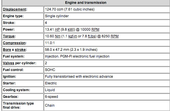 | This just may be the perfect powerplant for 100 mpg at 70 mph - a 125 with 6 speeds and just a little more power than Allert's AFN125i. It needs to be in a scooter frame and streamlined. Of course, the real problem is that I cannot ride one legally in California. Honda doesn't sell them in the US. I guess they think we don't want them. I will ask my friends at Honda to make it available here. You never know... sometimes they say yes. Look at what the FIM did about my streamlining requests. | ||||||||||||||||||||||||||||||||||||