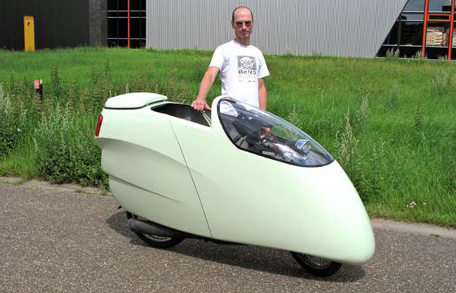 | Should we begin with a bigger engine and run it slower? Should we begin with a smaller engine and run it faster? Opinions are all over the place. Here is a big clue: A stock Helix gets 64 mpg average as a commuter. But it won't meet the "Vetter Conditions"* In powerful headwinds, a standard Helix will barely go 65 mph and gets 53 mpg at that speed. My streamlined Helix goes 75 mph into the winds and the mileage does not drop. The answer may be as simple as: "To get 100 mpg, begin with a 100mpg machine and streamline it to go 70 mph" Does this sound obvious? It just might be true. Did you think you were going to take a machine that gets 60 mpg around town, streamline it and somehow get 100 mpg at speed? I don't think so. What kind of machine gets 100 mpg? 125s get 100 mpg. But 125s won't go 70 mph, into a 30 mph wind, sitting up tall and comfortable. With proper streamlining I believe they will. Fortunately, Allert Jacobs, a fellow enthusiast in the Netherlands has begun with a 9 hp 125. He knows things we don't know. I am so impressed with his work that I asked him these questions: Dec. 9, 2009, Good morning Allert. I have been following your progress with admiration. Your work is great! Your web page is great! Thanks for putting this up. I have been tied up with other responsibilities and have not been able to work in my shop so much. But I am heading back. After I finish up my tooling, I must start over with new running gear. My question is this: Do you think that 9 hp is enough to go 70 mph into a 30 mph headwind? This is a crucial question to be answering. We know that the 17 hp Helix has more power than needed. If I could gear it up, I suspect it would top out at 90 mph. We cannot drive that fast in the US. Besides, we cannot gear it up. So, somewhere between 9 and 17 hp seems to be the magic number. My first choice, the Honda CBR 125 *(13.4 hp @10,000 rpm). But, it is not even sold in the US. What is your educated guess? You have been riding on 9 hp. You have a better idea than anybody in the world! Will it even go 70 mph into a 30 mph headwind? If not, how fast will it go in such conditions? Every little bit of information helps.