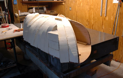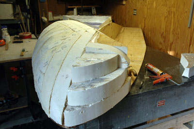| It is time to begin gluing in the foam. I use cheap, often free, contractor's urethane building insulation that has been damaged. Corners knocked off, etc. Free is good. The downside is that I must peel the foil off before I glue it because the foil messes up the seam later when I will file away the foam. Cut panels a little oversize and glue them on. Liquid nails is good. Buy a lot as a tube seems to get consumed for each piece of foam. | |||||||||||||||