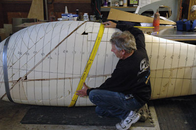 | The real foam streamlined Photoshop layer is in place to see where the bulkheads go. The parallel lines on the foam make it easy to translate. These bulkheads are not made up of straight lines and will have to be made of rivited together sections of aluminum. The front bulkhead is just behind the front wheel. The middle is my seat back and the back one is at the end of the standard Helix. | ![]() | ||||||||||||||||||||||||