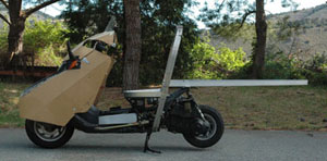 | It is time to remove the CAD (Cardboard Aided Design) and strip my trusty Helix of its plastic bodywork. The foamboard has served me well, having servived a thousand miles of riding. Only twice did I have to return home because of rain. Well, it is California. As far as I am concerned, the actual riding with this bodywork is the most important part of the design process. | ||||||||||||||||||||
