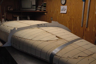 | Once I am confident that I have the right bulkhead shape, I grab a section of the body. This is easy... I just use a razor blade and cut quick arcs and piece them together where they will fit. A hot melt gun sticks them together. Notice the my flat work table. It is not a work table at all. It is a Starrett granite "Surface Table." Dead flat. I can tell where the centerline is this way. My first fairing in 1966 was crooked because I worked from the floor, which sagged under my weight. It was not dead flat. | ![]() | |||||||||||||||||||