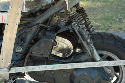 | The Helix engine is its own swing arm and rocks up and down. I must account for this. In addition, the air intake snorkle is in the way. I must make a new airbox cover to relocate the snorkle. All these things take time. (by the way, the engine hardly runs with the snorkle off) It will not being able to perfectly streamlined at the very bottom because the swing arm has to bounce up and down and the wheels stick out. | |||||||||||||||||||||||||||||||
