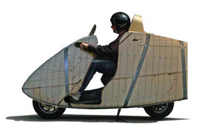 | As I build and ride this thing, solutions to problems emerge. For example, where will I put the license plate, tail light and turn signals? They cannot go on the point because it is a point and there is nothing there to put them on! The solution appeared when I realized that I could not completely streamline the area around my head. The air will be "Dirty" (unstreamlined there). I will mount these components in the headrest. Better to have just one area of "Dirty-ness" than many small ones. Actually, the lights will be more visible up there, thus we will be safer. In addition, we don't need the tail in the city. So, I will make the tail go on for cross country cruising and go off easily for inner city riding. This means that, with the tail off, my Helix will be the same length as stock. Quick! Name me any 2-wheeler than can carry 3 bags of groceries. I see this thing as a "two wheeled truck." If it cannot carry at least 3 bags of groceries, what good is it? The next step, then, is to make a "truck bed" and be sure it is streamlined. | |||||||||||||||||||||||||||||||